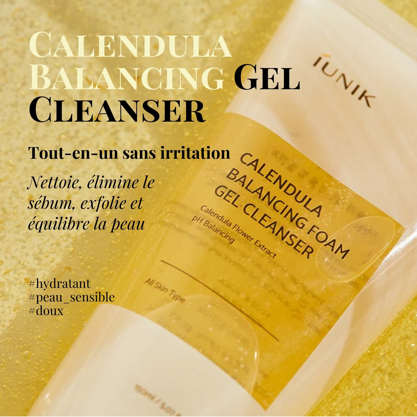 Le Calendula Balancing Foam Gel Cleanser est un nettoyant K-Beauty à faible pH (5,5 ± 1) conçu pour nettoyer efficacement la peau sans perturber sa barrière naturelle. Enrichi en extrait de Calendula Officinalis et en Centella Asiatica, il apaise les peaux sensibles tout en éliminant l’excès de sébum, les impuretés et les résidus de maquillage.