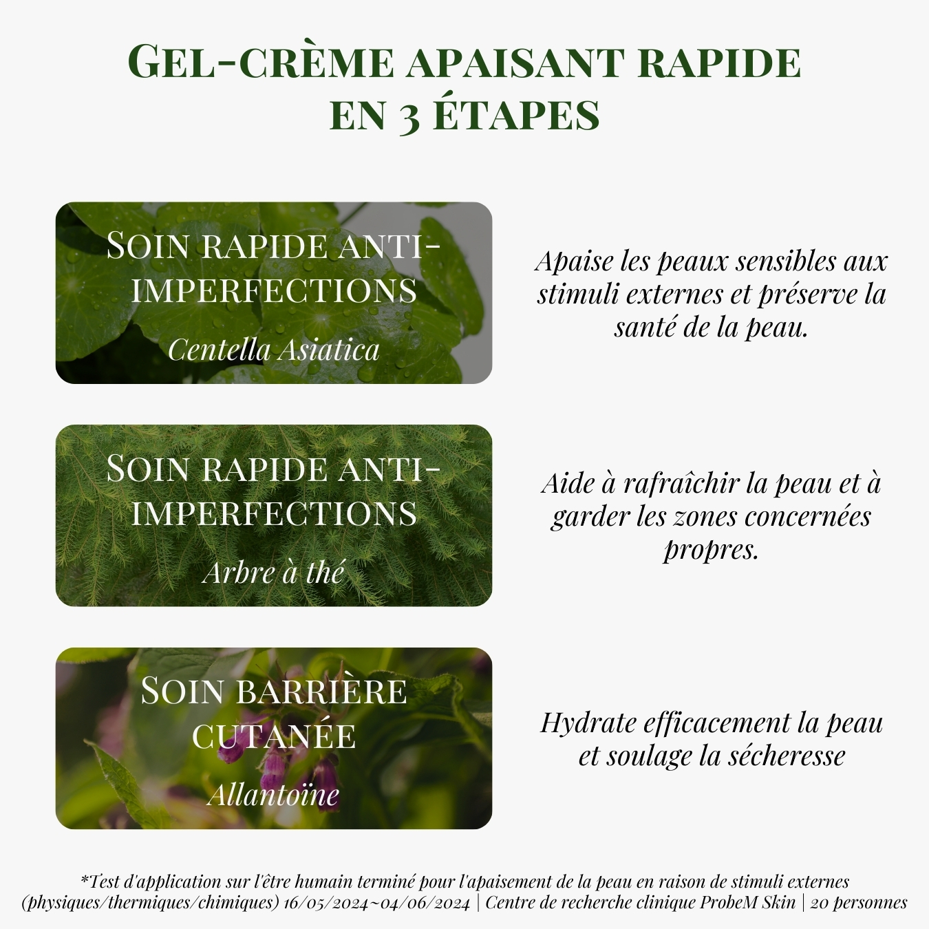 Eau de Feuille de Centella Asiatica, Eau de Feuille de Melaleuca Alternifolia, Butylène Glycol, Eau, Niacinamide, Méthyl Triméthicone, Polymère Croisé d’Acrylates/C10-30 Alkyl Acrylate, Arginine, 1,2-Hexanediol, Caprylyl Glycol, Diméthicone, Polymère Croisé de Diméthicone/Vinyl Diméthicone, Extrait de Centella Asiatica, Allantoïne, Extrait de Feuille de Melaleuca Alternifolia, Ethylhexylglycérine, Adénosine, Dipotassium Glycyrrhizate, Huile de Fruit de Citrus Aurantium Bergamia, Pentylène Glycol, Hyaluronate de Sodium, Extrait d’Aspalathus Linearis, Extrait de Racine de Glycyrrhiza Glabra, Extrait de Germe de Triticum Vulgare, Extrait de Brassica Oleracea Italica, Extrait de Feuille de Brassica Oleracea Capitata, Extrait de Medicago Sativa, Extrait de Graine de Raphanus Sativus, Extrait de Brassica Campestris, Extrait de Racine de Yucca Schidigera, Extrait de Résine de Commiphora Myrrha, Extrait de Feuille de Perilla Frutescens
