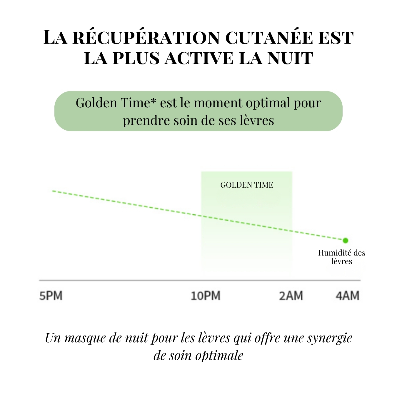Masque de Nuit pour les Lèvres : Lorsque les cellules mortes sont visibles et que vos lèvres sont particulièrement sèches, appliquez-en une quantité généreuse et prenez soin de vos lèvres pendant votre sommeil.