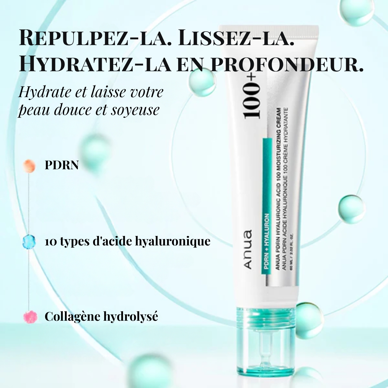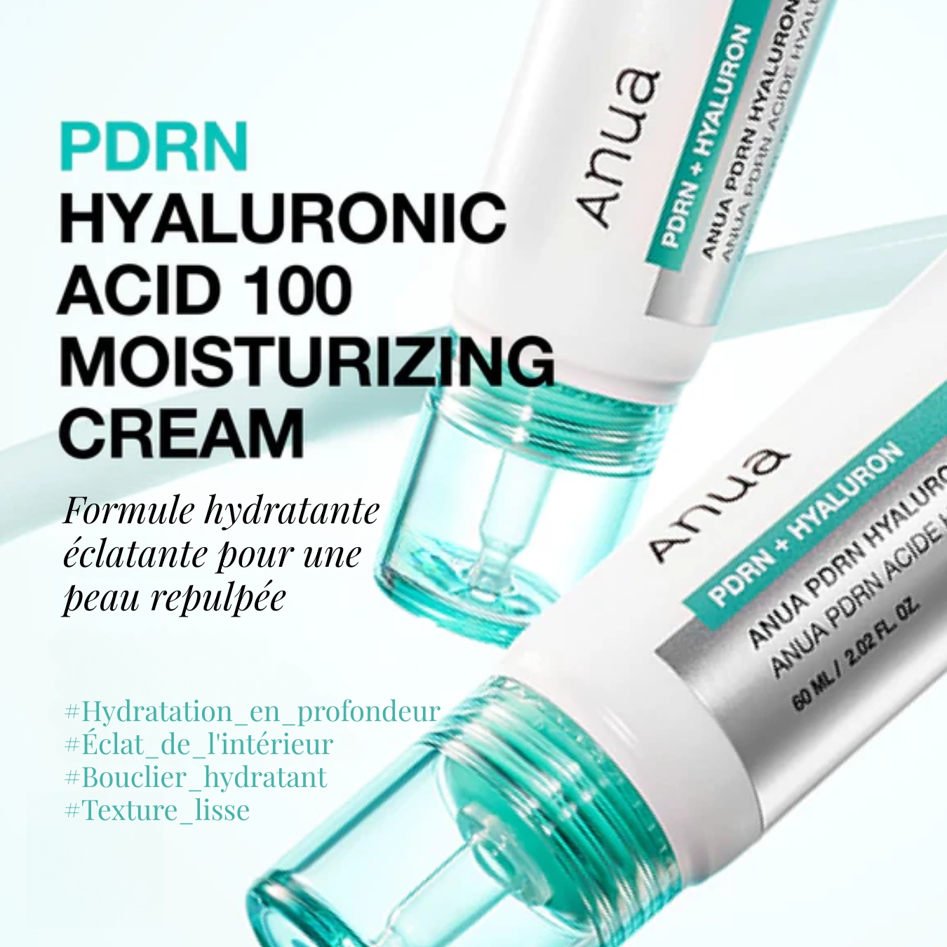 La PDRN Hyaluronic Acid 100 Moisturizing Cream de Anua est une crème ultra-hydratante conçue pour réparer, apaiser et repulper la peau en profondeur. Enrichie en PDRN (un actif régénérant puissant) et en acide hyaluronique à haut poids moléculaire, elle renforce la barrière cutanée, retient l’hydratation et aide la peau à retrouver souplesse et éclat.