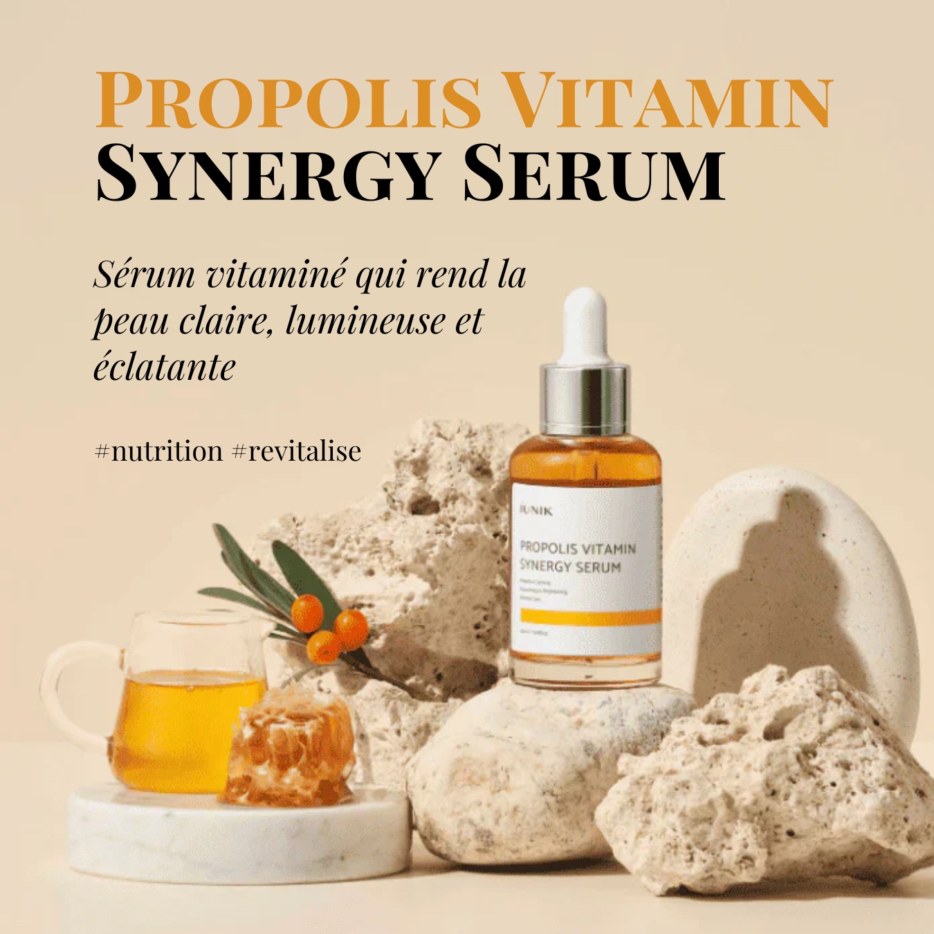 Le Propolis Vitamin Synergy Serum est un sérum multi-action conçu pour calmer, nourrir et éclaircir la peau sèche, sensible ou terne. Sa formule unique contient 70 % de propolis pour apaiser les irritations et renforcer la barrière cutanée, et 12 % d’argousier, riche en vitamine C, pour raviver l’éclat du teint.