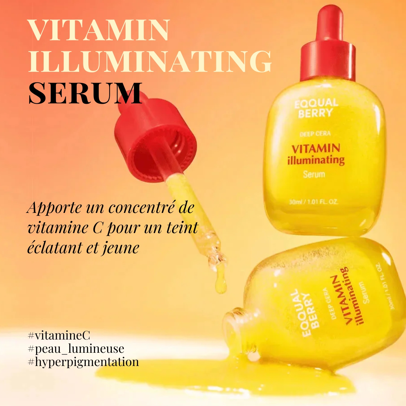 Le Vitamin Illuminating Serum est un sérum illuminateur puissant conçu pour éclaircir, hydrater et protéger la peau, tout en ciblant efficacement le teint terne et l’hyperpigmentation. Sa formule contient 40 % d’eau d’acérola, un ingrédient naturellement riche en antioxydants et en vitamine C, offrant une action éclat renforcée.